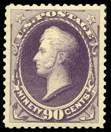1888, 90¢ purple (218), choice, virtually perfect centering with well balanced margins, deep rich color and immaculate, never hinged original gum; post office fresh and Extremely Fine to Superb. SMQ $11,400. Scott $2,750
