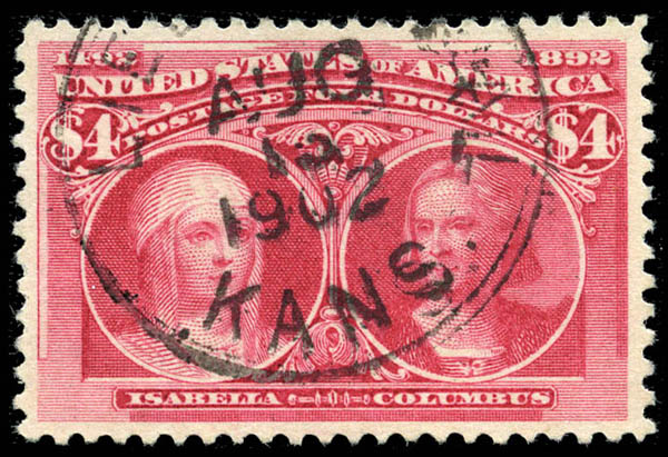 o 1893, $4 Columbian (244), choice centering and truly radiant color with a neat Liebenthal, Kans. c.d.s., wonderfully fresh and Extremely Fine. SMQ $2,150. Scott $1,250