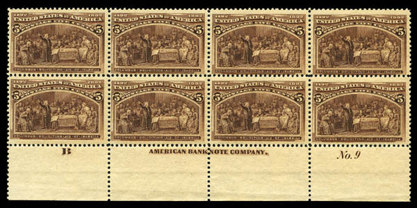 1893, 5¢ Columbian (234), bottom margin imprint & plate no. block of 8, nicely centered and crisp with pristine, never hinged original gum, minor separation at lower left, F.-V.F. Scott $4,500
