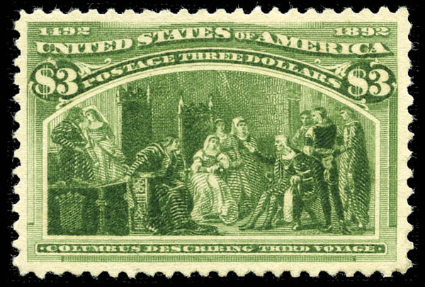 1893, $3 Columbian (243), bright, fresh and all but perfectly centered amid ample, beautifully balanced margins with radiant color and lightly hinged original gum; Extremely Fine to Superb. SMQ $4,800. Scott $1,600