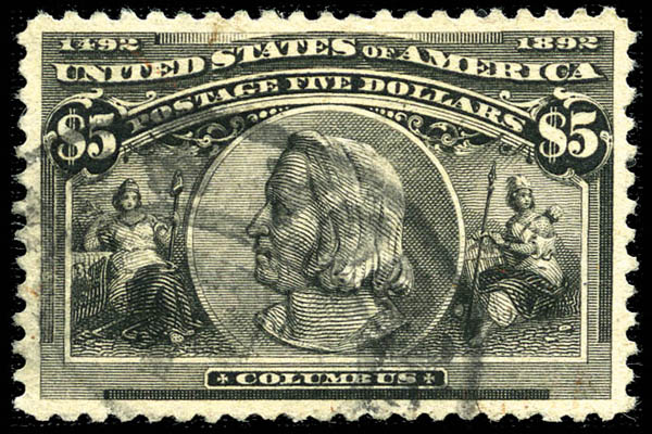 o 1893, $5 Columbian (245), well centered and remarkably fresh with large margins and a light Tomkinsville N.Y. c.d.s., Mar 28, 1895, Very Fine. Scott $1,400