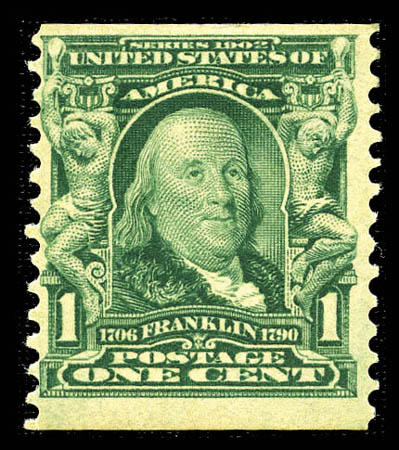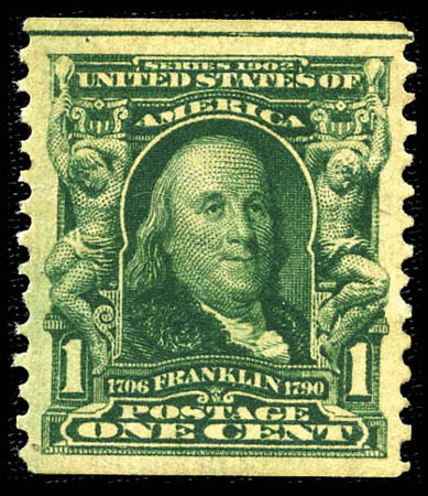 1908, 1¢ blue green coil (318), fresh and beautifully centered with full guide line at top, original gum, small filled thin, Extremely Fine appearance. Scott $5,000
