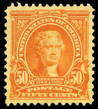 1903, 50¢ orange (310), perfectly centered with generous, beautifully balanced margins, vivid color and flawless, never hinged original gum, Extremely Fine to Superb. One of only four 95s awarded by PSE with just three graded higher; SMQ $8,000. Scott $1,200
