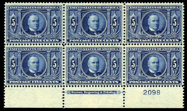 1904, 5¢ Louisiana Purchase (326), bottom margin imprint and plate number block of six, crisp, fresh and beautifully centered, original gum, never hinged, Extremely Fine; a truly choice plate block. Scott $1,850