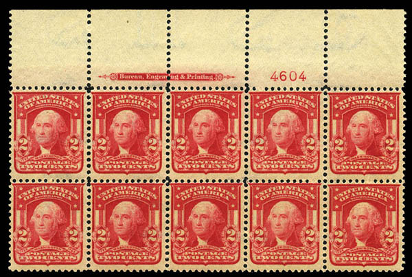 1903, 2¢ carmine, type II (319Fi), full top margin imprint & plate no. block of 10, deep, vibrant color, original gum, never hinged, Fine and rare; not priced as a plate block. Scott $1,750 as singles