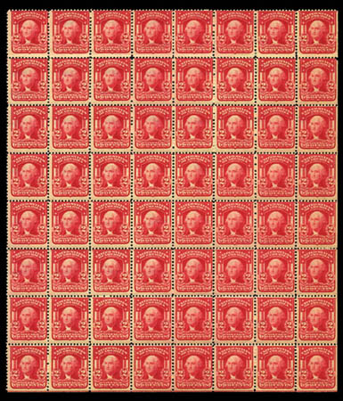 /  1903, 2¢ carmine, type II (319Fi), block of 32 with straight edges at bottom and right, bright and fresh, original gum, most never hinged, perfs clear to just in at top, some separation, top row creased, about Fine and rare. Estimate $1,500 - 2,000