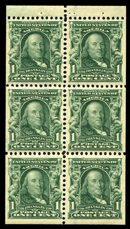 BK  1903, 1¢ blue green (300b), booklet pane of 6, remarkably well centered with wide margins, rich color and fresh paper, o.g., never hinged, choice and Extremely Fine. Scott $1,150