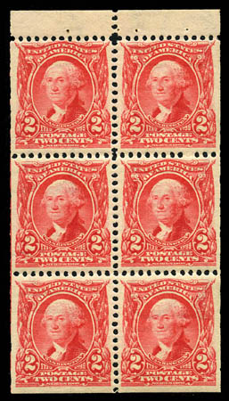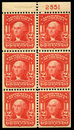 BK  1903, 2¢ carmine (301c), booklet pane of 6, position I, exceptionally well centered throughout, beautiful fresh color, o.g., never hinged, Extremely Fine. Scott $950