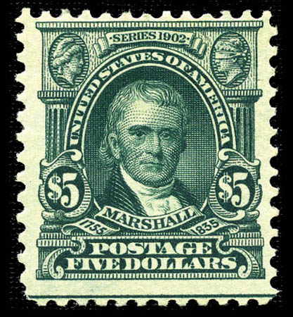 1903, $5 dark green (313), exceptionally bright and fresh with deep, dark color, original gum, F.-V.F. Scott $2,250