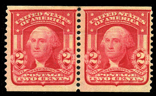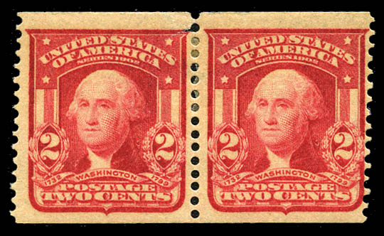 1906, 2¢ scarlet, International Vending Co. perfs (320b), perf 12½ pair, nicely centered, o.g., hinge remnant, left stamp with a small thin and tiny tear at top right, otherwise F.-V.F. Scott $2,000