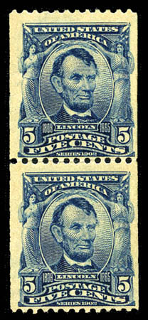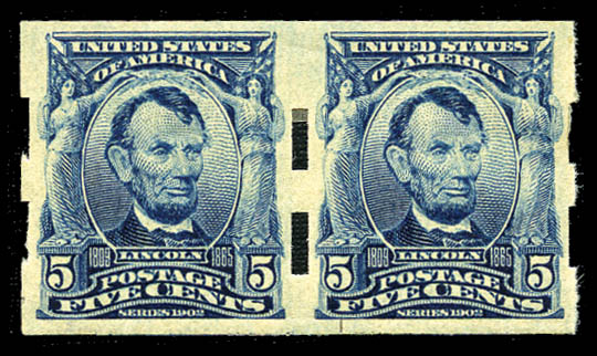 1908, 5¢ blue, U.S. Automatic Vending type II perfs (315), line pair, exceptionally well centered and margined, strong rich color, o.g., left stamp with tiny h.r., right stamp with small thin spot, otherwise Very Fine and quite rare. Scott $2,250
