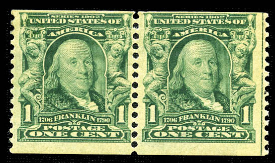 1908, 1¢ blue green coil (318), pair with guide line and paste-up at right, deep, vibrant color, original gum, very lightly hinged, fresh and Fine. Scott $10,000
