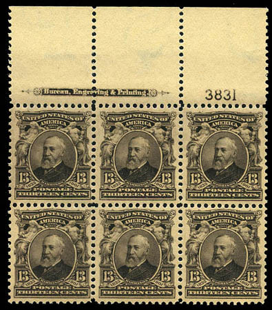 1902, 13¢ purple black (308), full top margin imprint and plate no. block of six, beautifully centered, fresh and crisp, original gum, never hinged, Extremely Fine and choice, quite scarce in this superb quality. Scott $1,150