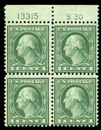 1921, 1¢ green, rotary coil waste (545), top margin plate no. & "S30" block of 4, original gum, never hinged, fresh and Fine. Scott $2,150
