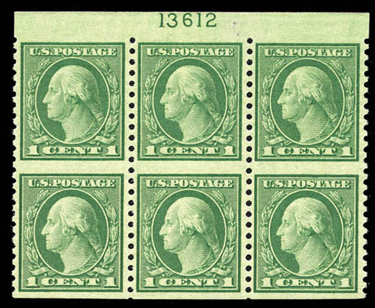 1919, 1¢ green, imperf horizontally (538a), top margin plate no. block of 6, beautifully centered, fresh and solid, original gum, lightly hinged, Extremely Fine and choice; rarely seen as a plate block of six. Scott $990+