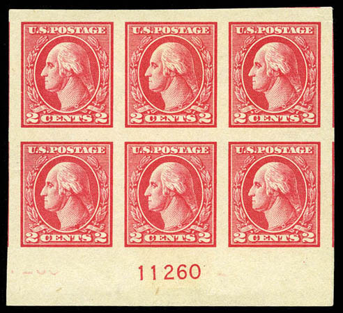 1918, 2¢ carmine, Offset imperf, type V (533), bottom margin plate no. block of 6, enormous margins, original gum, barest trace of hinging, Extremely Fine to Superb. Scott $1,100