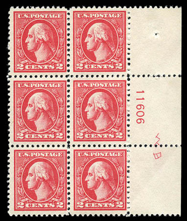 1918, 2¢ carmine Offset, type VI (528A), right margin plate no. block of 6 with initials "WB" (pressman Walter Boddecker), exceptionally bright and fresh, Fine and quite rare. Scott $800+