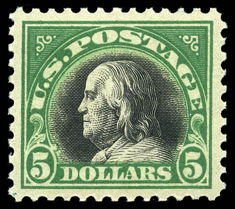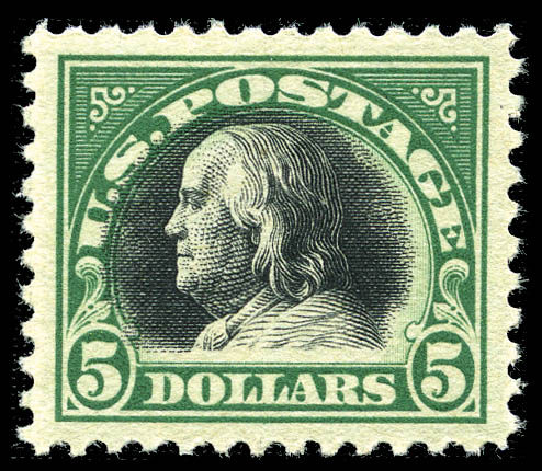 1918, $5 deep green & black (524), all but perfectly centered with large margins, bright color and never hinged original gum, post office fresh and Extremely Fine to Superb. SMQ $950. Scott $375