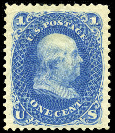 1875 Re-issue of 1861-67 issue, 90¢ blue (111), exceptionally well centered within wide margins, intense color on bright paper., o.g., Extremely Fine, only 317 sold. Scott $6,750