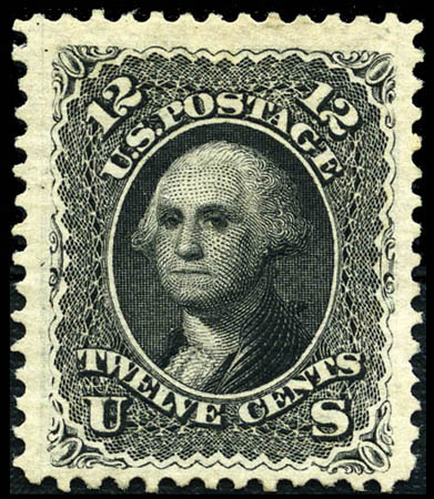 1875 Re-issue of 1861-67 issue, 12¢ black (107), beautifully centered with extra large margins, razor sharp impression with intense color, o.g., light natural gum bend, remarkably fresh and Very Fine, only 389 were sold. Scott $4,250