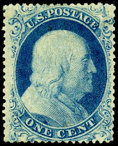 1861, 1¢ blue, type I (18), choice centering clearing showing the design characteristics at top and bottom, bright color with a clear impression. O.g. Very Fine. Scott $2,500