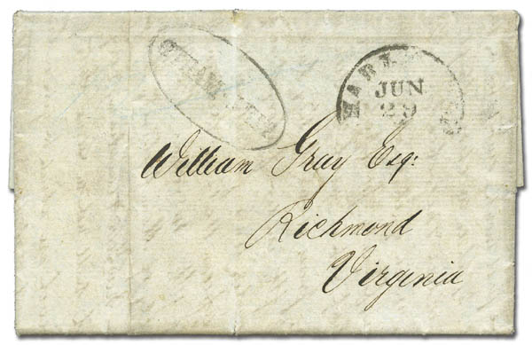 Confederacy, Incoming Blockade cover from England, folded business letter datelined Liverpool, 4 June 1864 to Richmond with partial Jun 29 Charleston entry c.d.s. and oval "Steam-Ship" handstamp, very faint manuscript "12" rate in blue pencil, letter written on blank leaf of two-page printed letter from the same firm datelined London, 31 May; F.-V.F.