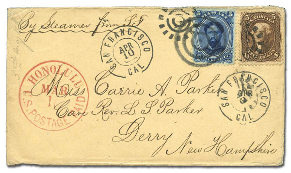 Hawaii, 1866, 5¢ blue (32), used with U.S. 5¢ Brown (76), both tied by San Francisco cogwheels on cover to Derry, N.H., the Hawaiian stamp additionally tied by 4-ring target, clear red "Honolulu U.S. Postage Paid Mar. 11" c.d.s. at left, carried on the Ethan Allen, "San Francisco Cal. Apr. 3" double circle at right, and a 2nd one struck at top dated Apr. 10 when the cover left by Panama-bound steamer, neat 1867 docketing on reverse indicates the contents were written at Wailuku, March 3, Very Fine, a beautiful mixed franking showpiece. Estimate $3,000 - 4,000