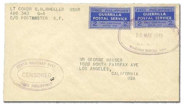 Philippines, 1943 Free Philippines Guerrilla Postal Service, 2c blue, two singles tied by purple oval "Posted in the Free Philippines, Mindanao Guerilla Area, 16 May, 1945, M.D. No. 10" on cover from Lt. Cdr. M.M. Wheeler to Los Angeles, Cal., matching "Tenth Military Dist." censor handstamp at lower left initialed "W" [for Wendell Fertig], Very Fine. With just 500 stamps issued and only about 36 covers recorded, this may well be the only double franking in existence. Accompanied by a six-page article by Walter W. Adler on the history of the stamps from the Sept 1982 issue of The American Philatelist. Estimate $4,000 - 6,000