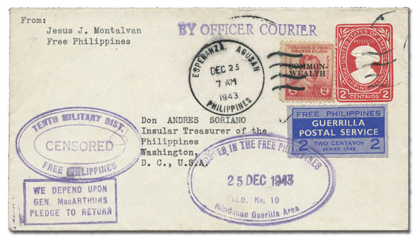 Philippines, 1943 Free Philippines Guerrilla Postal Service, 2c blue, tied by purple oval "Posted in the Free Philippines, Mindanao Guerilla Area, 25 Dec 1945, M.D. No. 10" on 2c entire (U41) from Capt. Jesus J. Montalvan to Don Andres Soriano, Insular Treasurer of the Philippines, Washington, D.C., matching "Tenth Military Dist." censor handstamp (not initialed), used with 2c Commonwealth ovpt (411) tied by Esperanza, Agusan duplex, also Christmas Day, additional matching patriotic handstamp "We depend upon MacArthur's pledge to return" and "By Officer Courier"; Very Fine. Only 500 stamps were issued and only about 36 covers have been recorded. Accompanied by a six-page article by Walter W. Adler on the history of the stamps from the Sept 1982 issue of The American Philatelist.