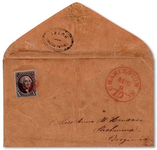 1847, 10¢ black (2), large margins, strong impression and gorgeous deep shade, tied by red grid with matching "Charleston S.C. 10 Aug. 9" c.d.s. on buff envelope with "Charleston Hotel" in double oval on flap, to Richmond, Va., negligible light envelope creases completely clear of any markings or the stamp, Very Fine. Estimate $1,500 - 2,000
