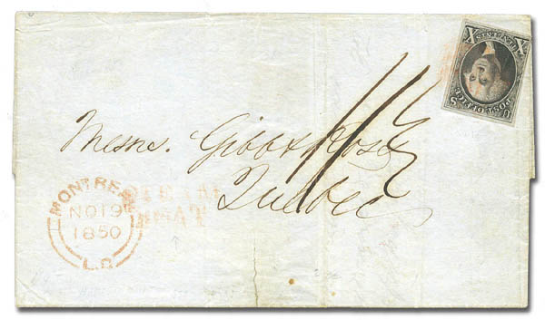 1847, 10¢ black (2), large margins to touched BL, tied by red grid on 1850 folded cover to Quebec with light but readable "STEAM/BOAT" applied at Albany, red Montreal postmark at lower left, Quebec backstamp, docketing indicates New York City origin, closed cover tear at B. center, Fine and scarce. Estimate $1,500 - 2,000