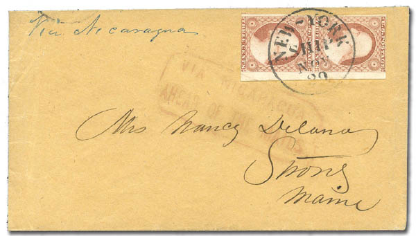 "Via Nicaragua / Ahead of the Mails.", two-line handstamp in red tying 1851 3¢ dull red (11) vertical pair with right sheet margin, and also tied upon arrival with "New-York, Ship, Nov 29" c.d.s. on buff cover to Strong, Me.; endorsed "Via Nicaragua"; Very Fine and choice. Estimate $500 - 750