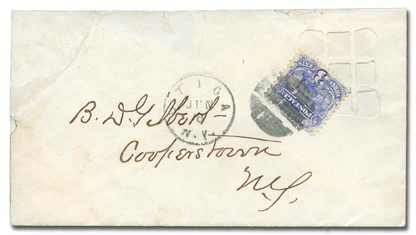1869, 3¢ ultramarine (114), tied by split cork cancellation duplexed with "Utica N.Y. Jun 8" c.d.s. on Leeds Patent envelope to Cooperstown, N.Y.; upper left corner cover replaced, otherwise Fine. Estimate $600 - 800