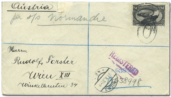 1898, $1 Trans-Miss. (292), tied by mute oval cancels on registered cover from New York to Vienna Austria, postmarked magenta New York c.d.s.s on reverse, Oct 21, 1935, Vienna receiver on front, Aug 31; stamp F-VF, small repaired nick at top of cover, otherwise Very Fine. Scott $4,000 for a contemporary usage. Estimate $1,500 - 2,000