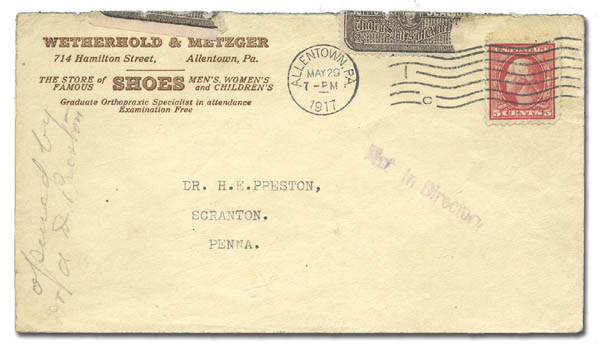 1916, 5¢ carmine error (467), well centered with a couple short perfs, tied by Allentown, Pa. machine cancel on a Shoe advertising cover, two P.O. seals (OX17) applied at top, handstamped "Not in Directory", manuscript opened by "Dr. A.D. Preston" (cover addressed to a Dr. H.E. Preston); Fine to Very Fine and rare. Scott $5,000 ++