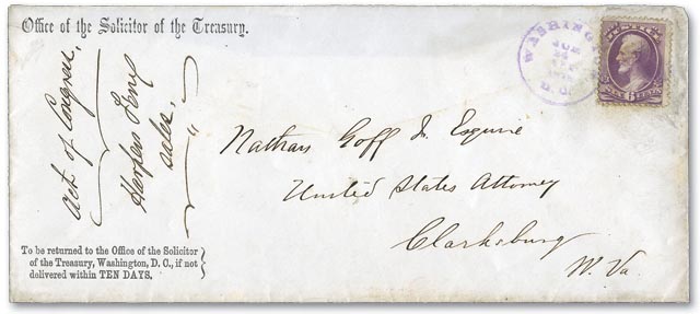Justice Dept., 1873, 6¢ purple (O28), tied on cover by the violet "Washington, D.C. Jun 24, 1878" duplex with quartered cork cancel on legal size cover to Clarksburg, W.V., Office of the Solicitor of the Treasury corner card, manuscript docketing "Act of Congress"; backflap missing, minor edge wear, slight gum toning around stamp, Fine. Scott $1,200