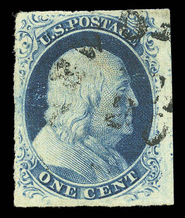 1851, 1¢ blue, type III (8), relief C from plate 4, clear to large margins plainly showing small break at top and large break at bottom, partial New Orleans town cancel, Very Fine and quite scarce. Scott $3,250