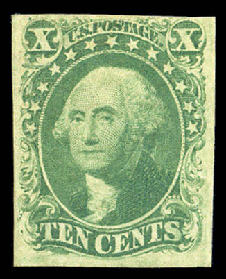 1855, 10¢ yellowish green, type II (14 var.), clear to mostly large margins with bright color and full original gum that has been somewhat redistributed, very minor, light all-over toning, F.-V.F.