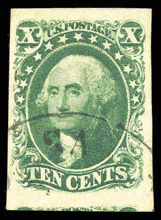 1855, 10¢ green, type II double transfer (14 var.), position 51L, large to huge margins with adjacent stamp visible at bottom, finely detailed, prooflike impression and neat partial town cancel, wonderfully fresh and Extremely Fine. Scott $280