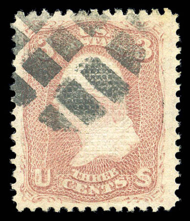 1867, 3¢ rose, partially erased A. grill (83 var.), exceptionally fresh and well centered with unusually large margins and a neat segmented cork cancel, Very Fine and choice. Scott $2,750