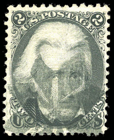 1867, 2¢ black, D. grill (84), nearly perfectly centered with a prooflike impression and a perfectly struck "rosette" type cancel, few small thin spots; choice, Extremely Fine appearance. Scott $4,500