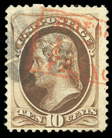 1870, 10¢ brown, grilled (139), nicely centered with a light cork cancel and a red boxed Bremen, Germany exchange office marking, F.-V.F. and most attractive.