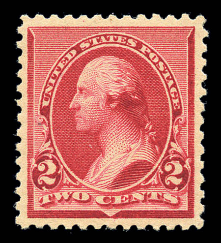 1890, 2¢ carmine, cap on both "2's" variety (220c), beautifully centered, warm rich color, fresh full original gum with completely imperceptible hinging, an Extremely Fine gem. SMQ $1,050. Scott $625