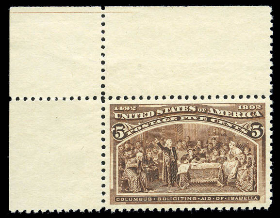 1893, 5¢ Columbian (234), upper left corner margin single, perfectly centered, stunning color and a razor sharp impression, fresh crisp never hinged original gum, Superb. SMQ $4,000. Scott $210