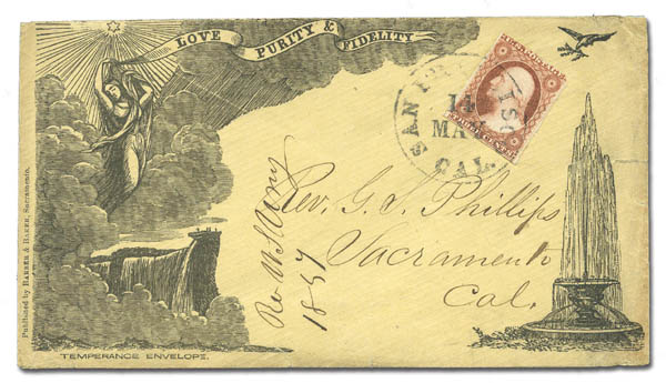 Western Temperance, beautiful all-over design by Barber & Baker on envelope to Sacramento with 1851 3¢ brownish carmine (11), margins to cutting, tied by "San Francisco Cal. 14 May" c.d.s., 1857 docketing, small tear at R., still Very Fine, very rare design.