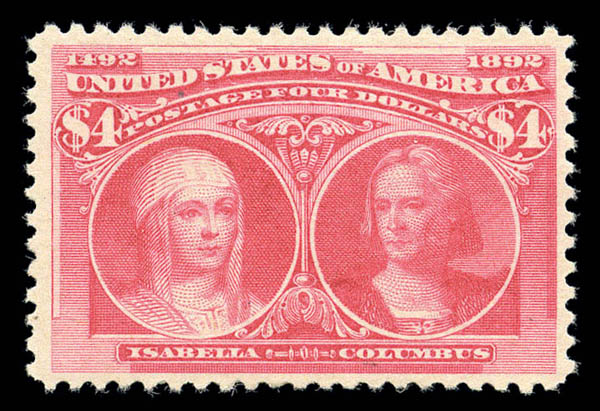 1893, $4 Columbian (244a), beautifully centered with absolutely radiant color, original gum, fresh and choice Very Fine with incredible eye-appeal. Scott $2,250