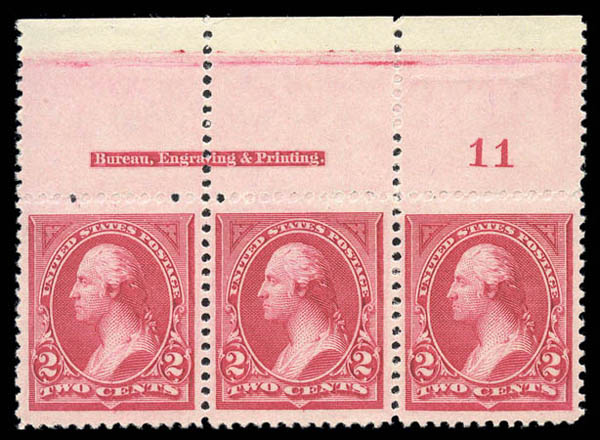 1894, 2¢ carmine lake, type I (249), full top margin imprint and plate number strip of three, virtually perfectly centered with large margins and deep, deep color, original gum, never hinged with a couple minor natural gum skips, post office fresh and Extremely Fine. Scott $1,450