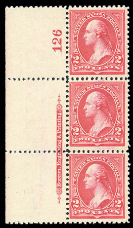 1894, 2¢ carmine, type II (251), left imprint and plate no. 126 strip of three, nicely centered and exceptionally fresh, original gum, never hinged, Fine and quite rare, especially never hinged. Scott $3,500