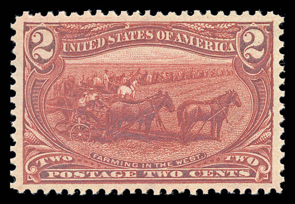1898, 2¢ Trans-Miss. (286), near perfect centering within wide balanced margins, stunning rich color, never hinged original gum, Extremely Fine. SMQ $2,500. Scott $75