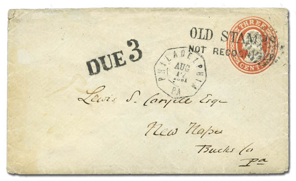 "Old Stamps/ Not Recognized", bold straightline along with "Due 3" handstamp on 3¢ red, die 5 entire (U9), grid cancel and "Philadelphia Pa Aug 17 1861" octagon datestamp, addressed to New Hope, Pa.; tiny edge tears at corners, Very Fine. [Not the earliest documented use—see below. Estimate $6,000 - 8,000